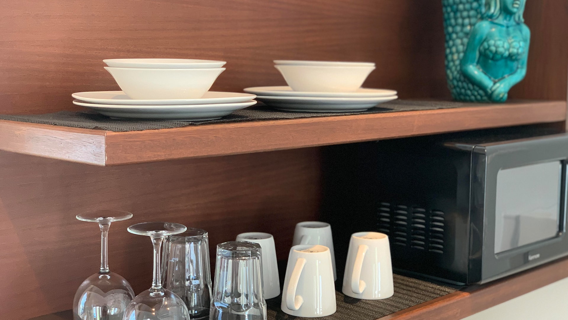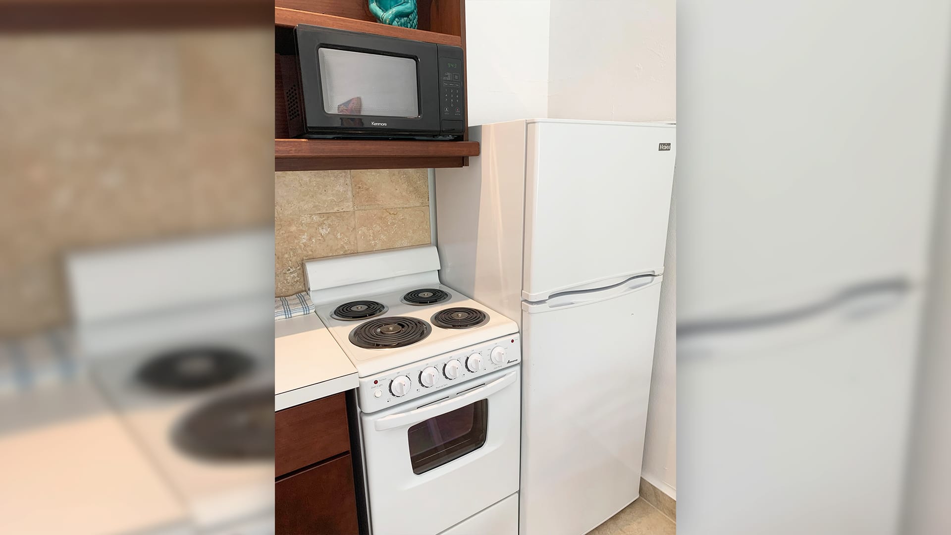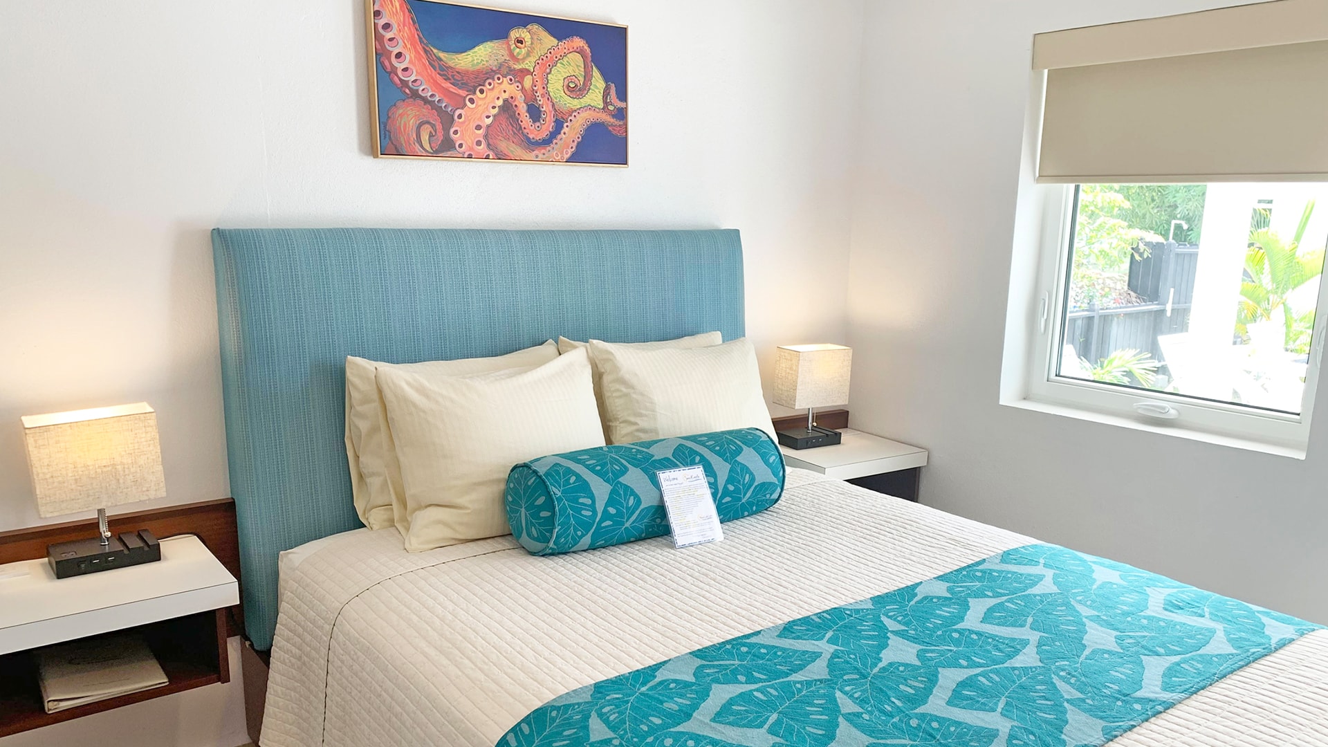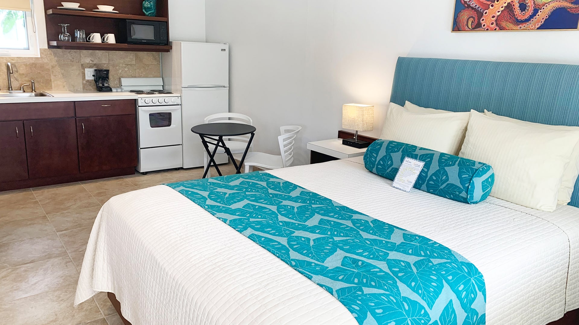 Our Courtyard Kitchens are a spacious studio room featuring a full kitchen, dining area, queen bed and private bath.
