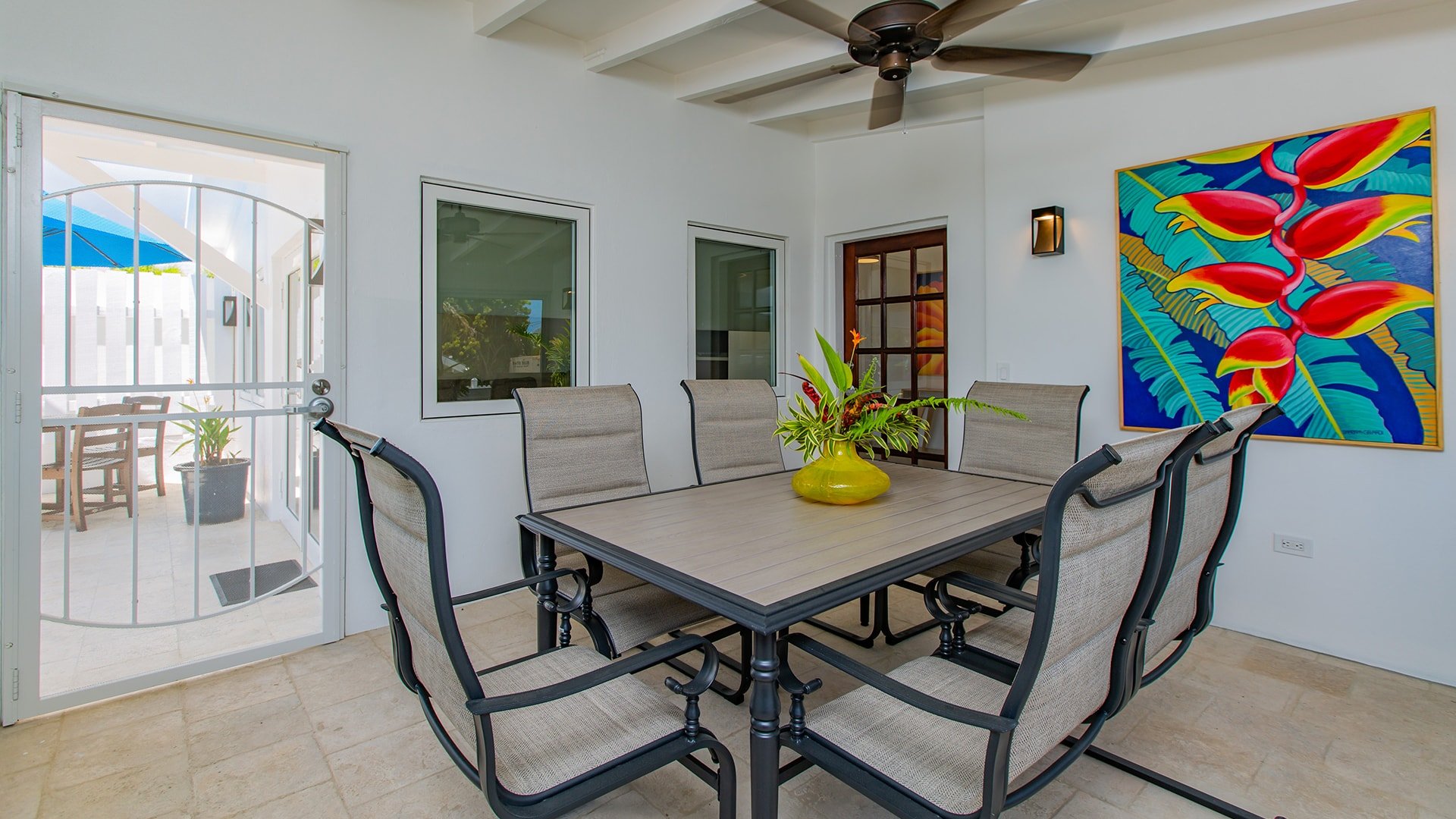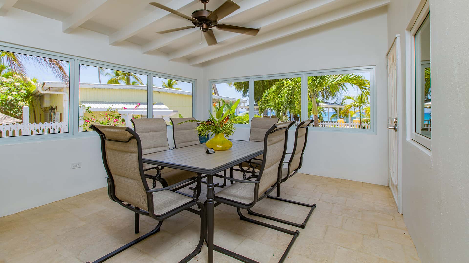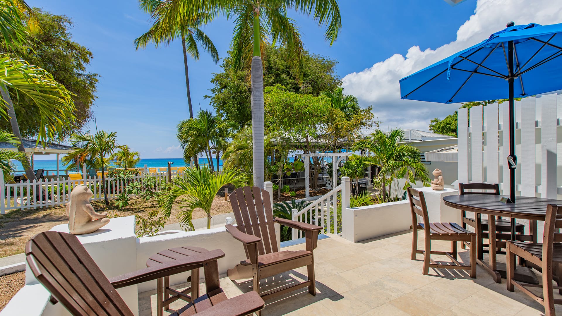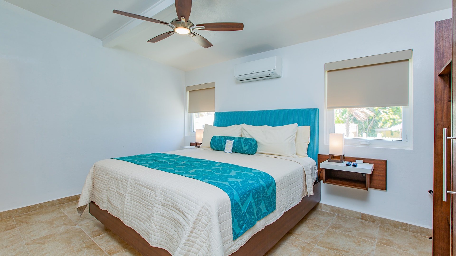 A spacious villa with two king bedrooms with full en suite bathrooms, just steps from the Caribbean Sea. Well equipped with a full kitchen, spacious living/dining area, screened in porch, and private patio.