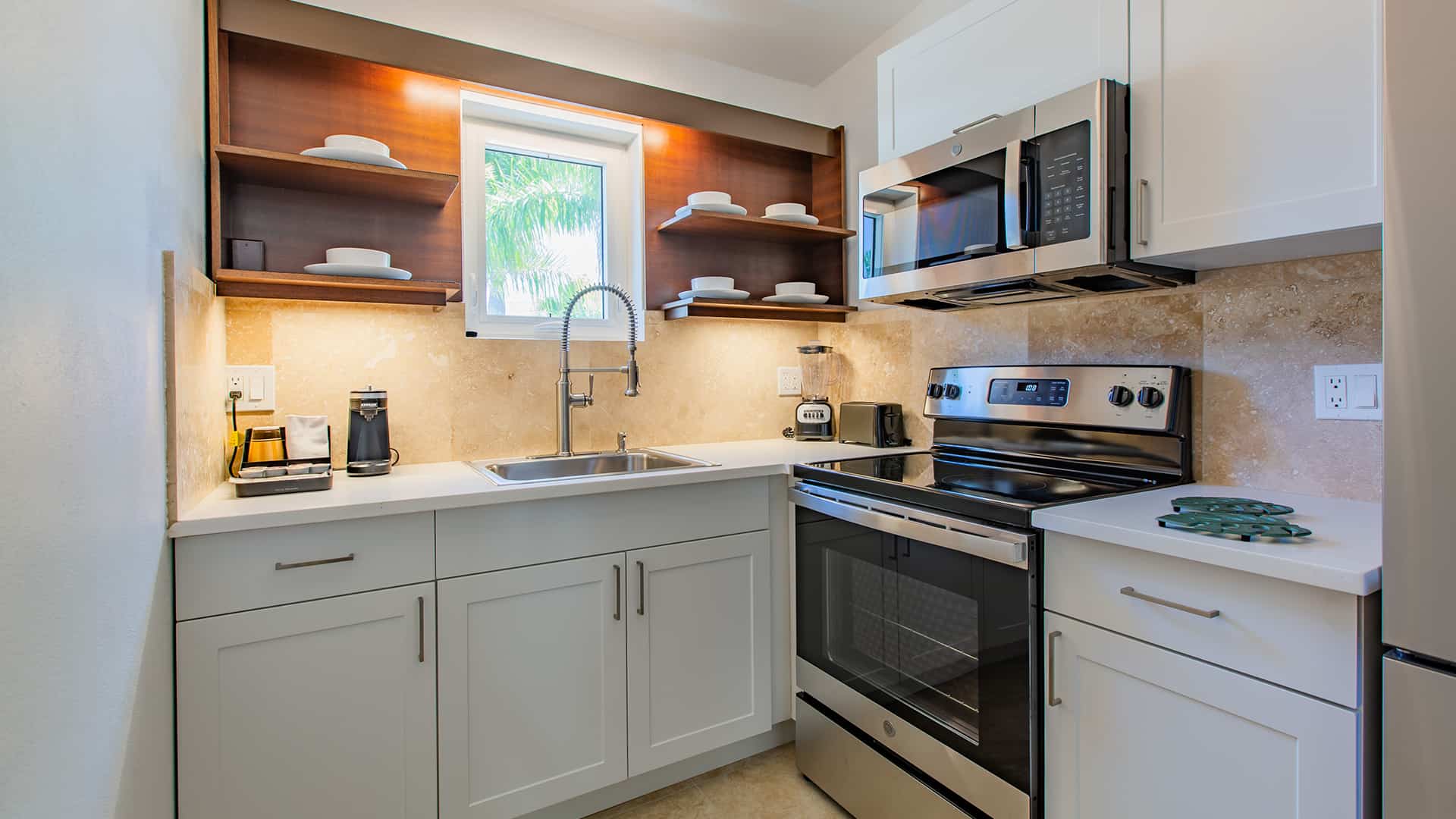 - Full kitchen with microwave and coffee maker