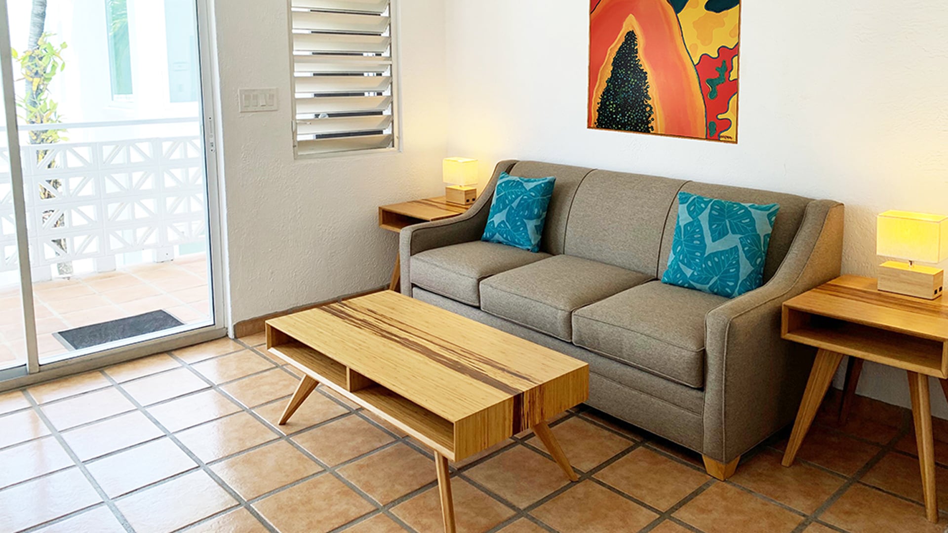 A spacious suite with a living room, full kitchen, separate king bedroom, and a private bath over-looking a lush tropical garden.
