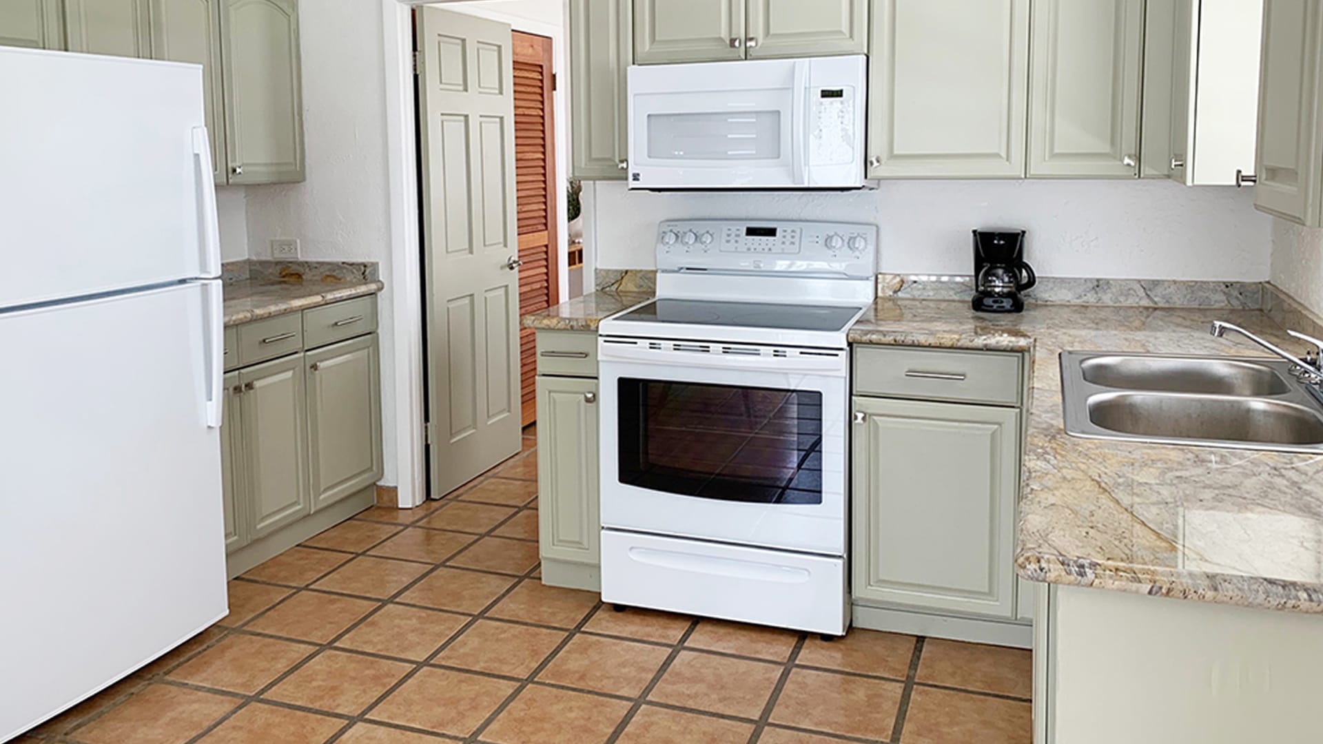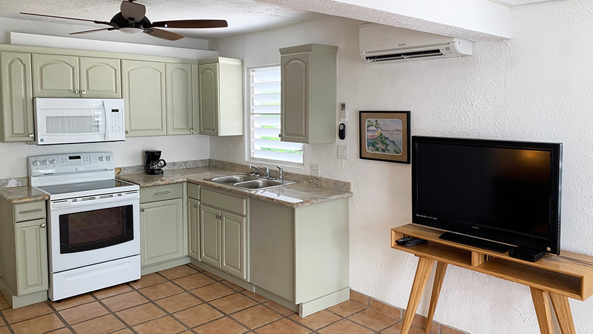 • Full kitchen with microwave and coffee maker
